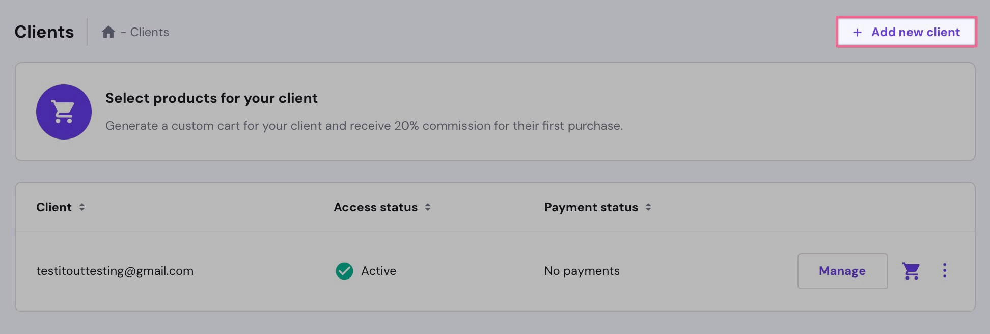 To add a new client, you just have to click on the ‘+ Add new client’ button and fill in the client’s email address, (note that each client has to have an active Hostinger account).