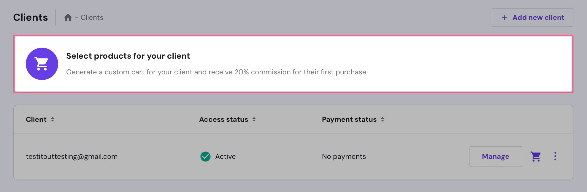 Getting started with earning commissions is as simple as clicking on the ‘Select products for your client’ in the Clients tab.