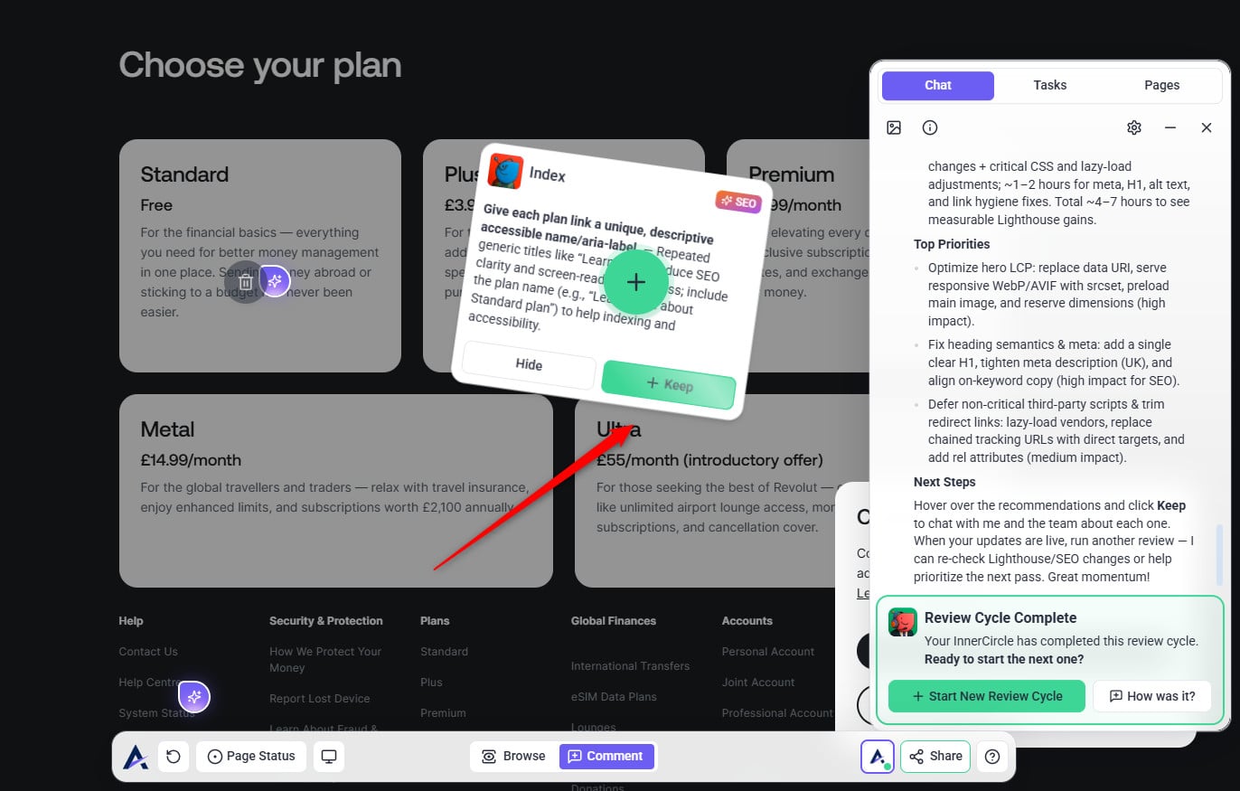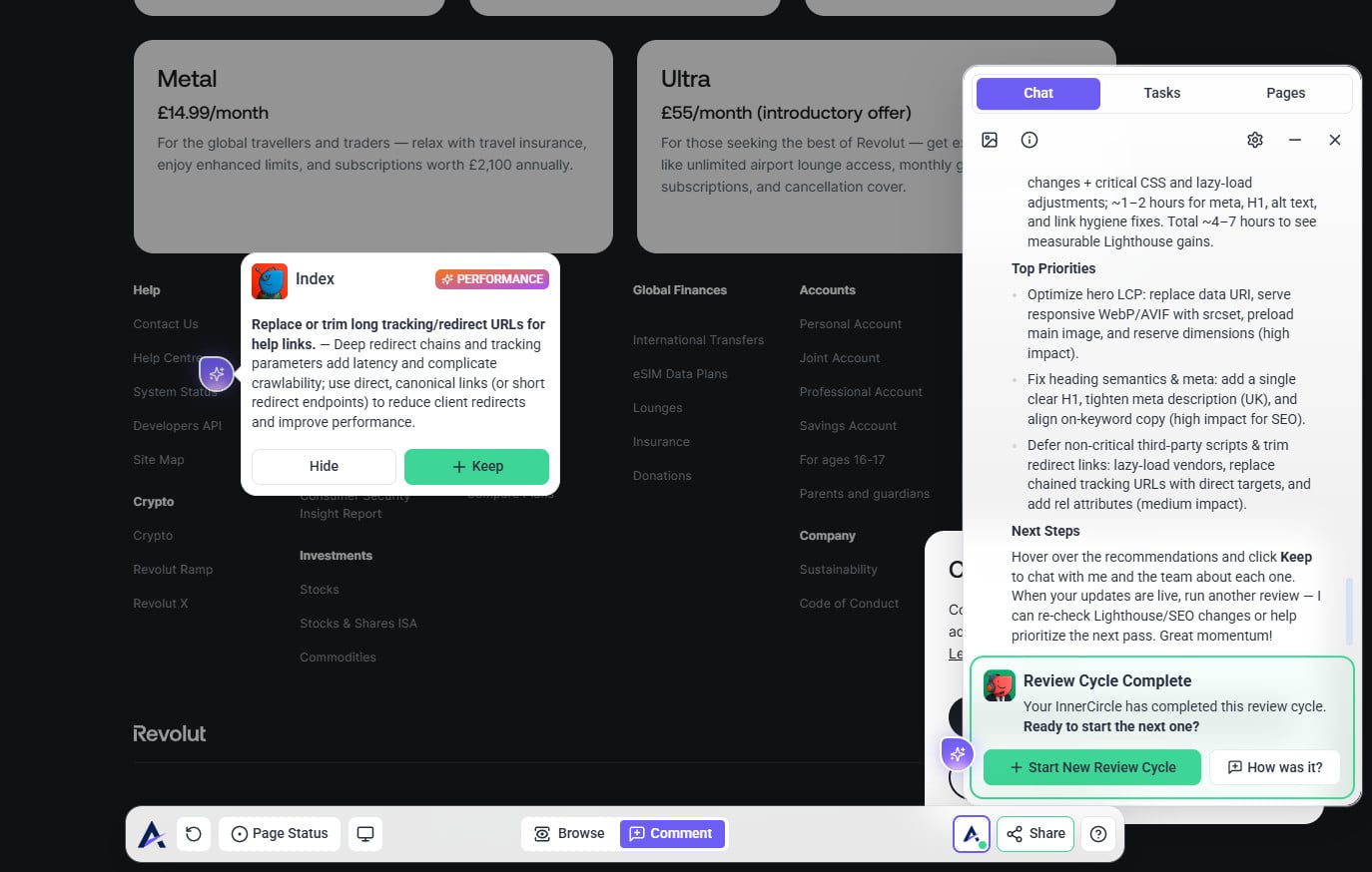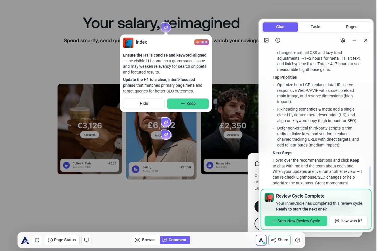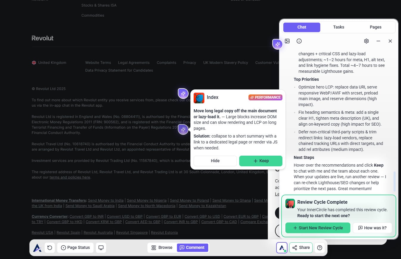 Index is most effective when paired with other Inner Circle agents, creating a complete workflow that covers SEO, copy, design, accessibility, and technical performance. While Index ensures the page is semantically structured, crawlable, and optimized for search, other agents address complementary areas: