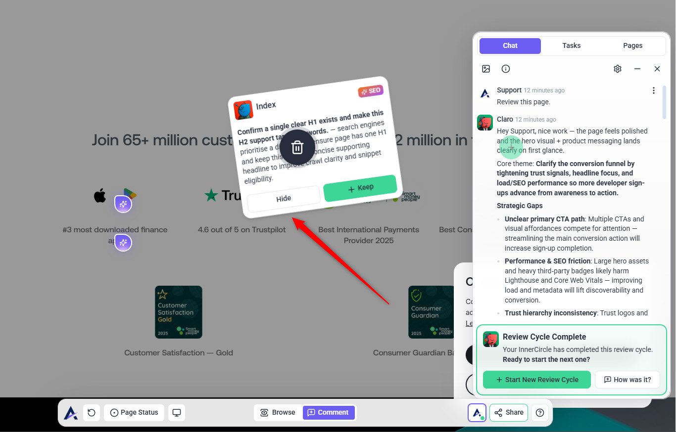 After reviewing, decide how to act on each sticker. Every finding is actionable — you can keep it as a task or dismiss it if irrelevant.