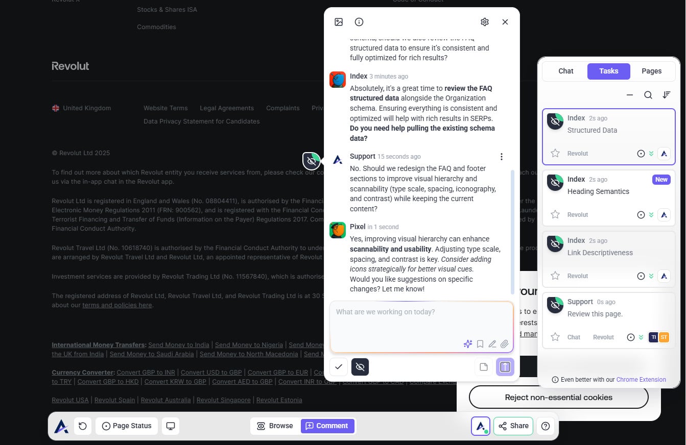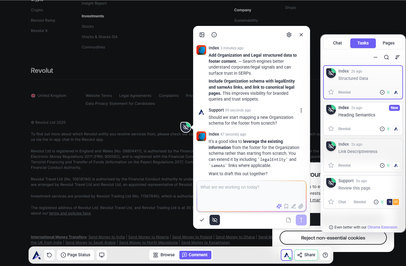 Once activated, Index silently audits your page. He checks heading hierarchy, metadata, links, schema, and crawlability — all without interrupting your workflow.