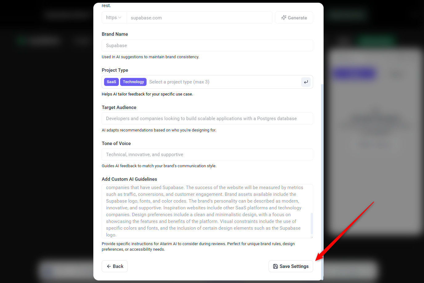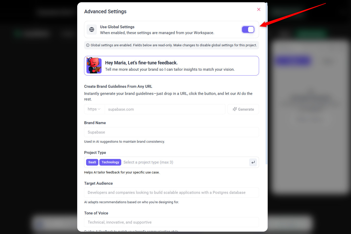 Tip: Toggle off “Use Global Settings” if you want to customize brand guidelines for each project.