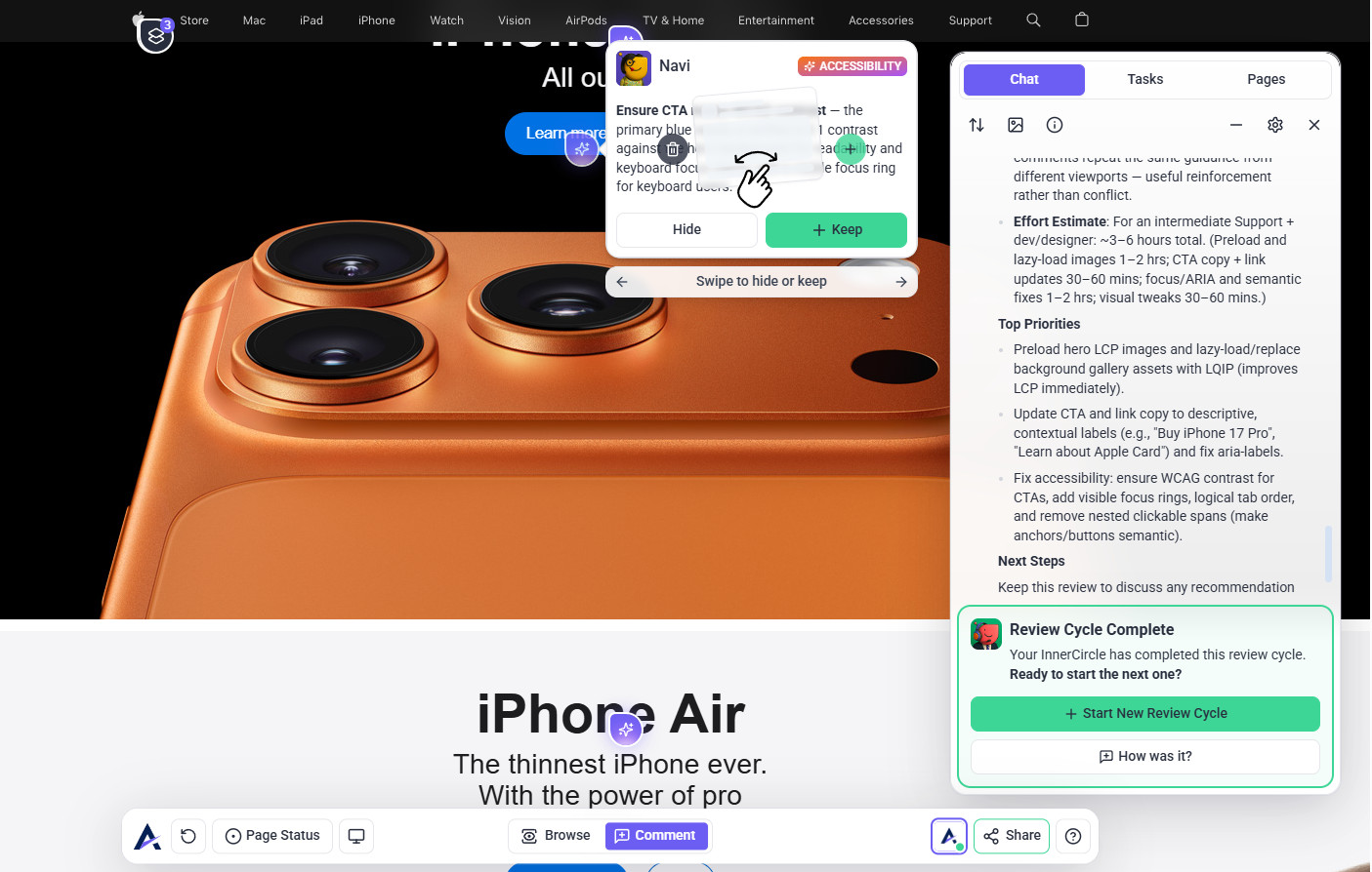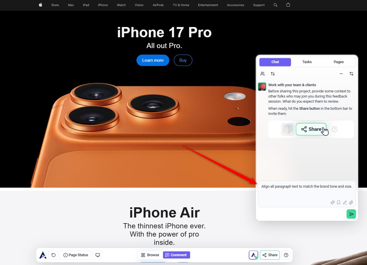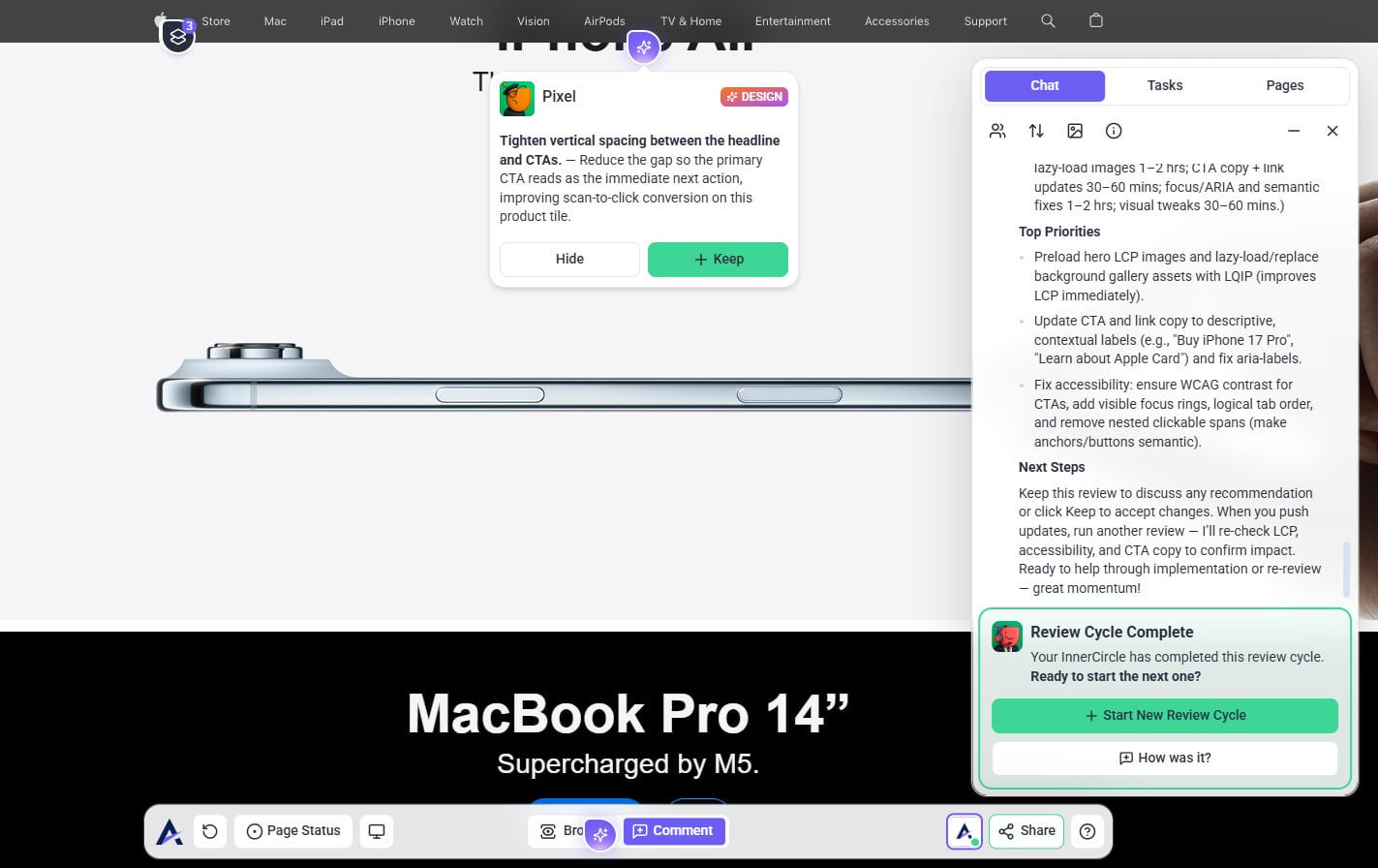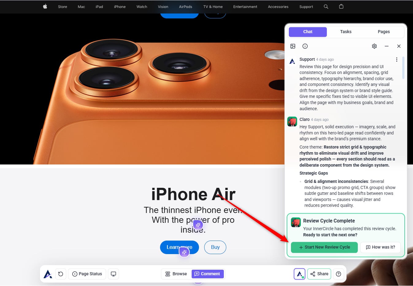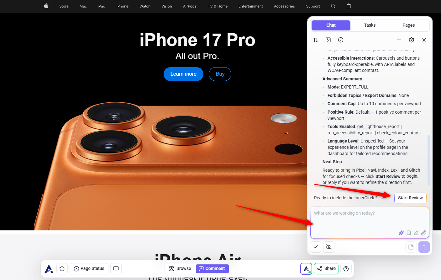 Tip: The review modal prioritizes your intent. When you state a specific request (e.g., “check this page on mobile”), the AI tailors its feedback to that goal — making reviews more focused, relevant, and actionable instead of generic.