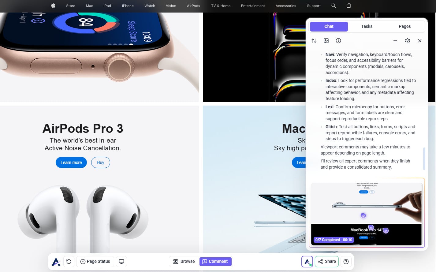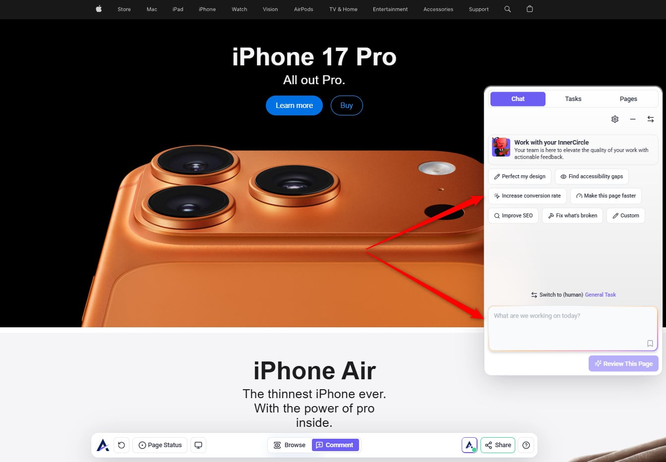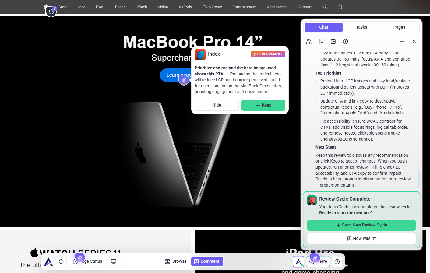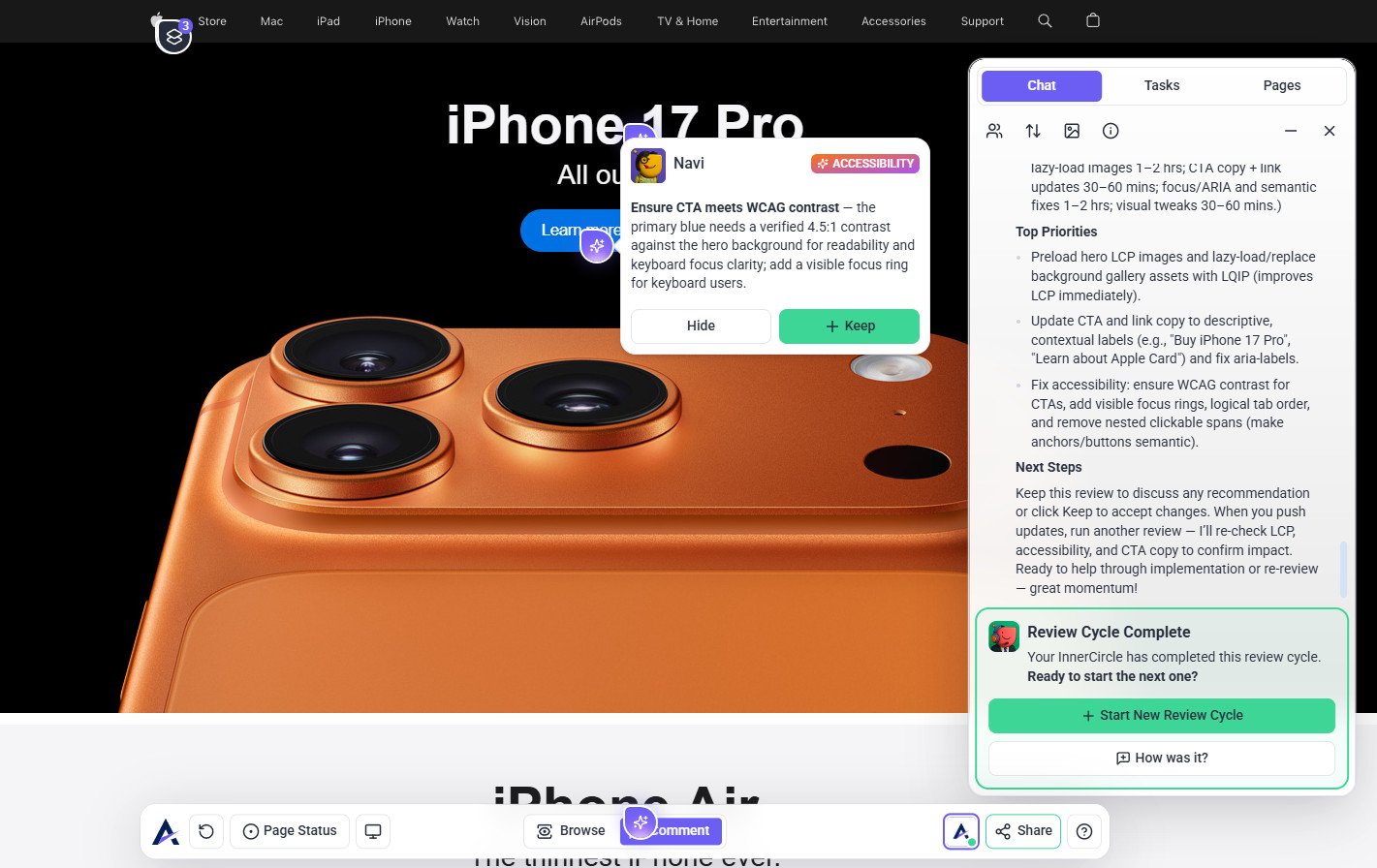 Tip: The review modal prioritizes your intent. When you state a specific request (e.g., “check this page on mobile”), the AI tailors its feedback to that goal — making reviews more focused, relevant, and actionable instead of generic.
