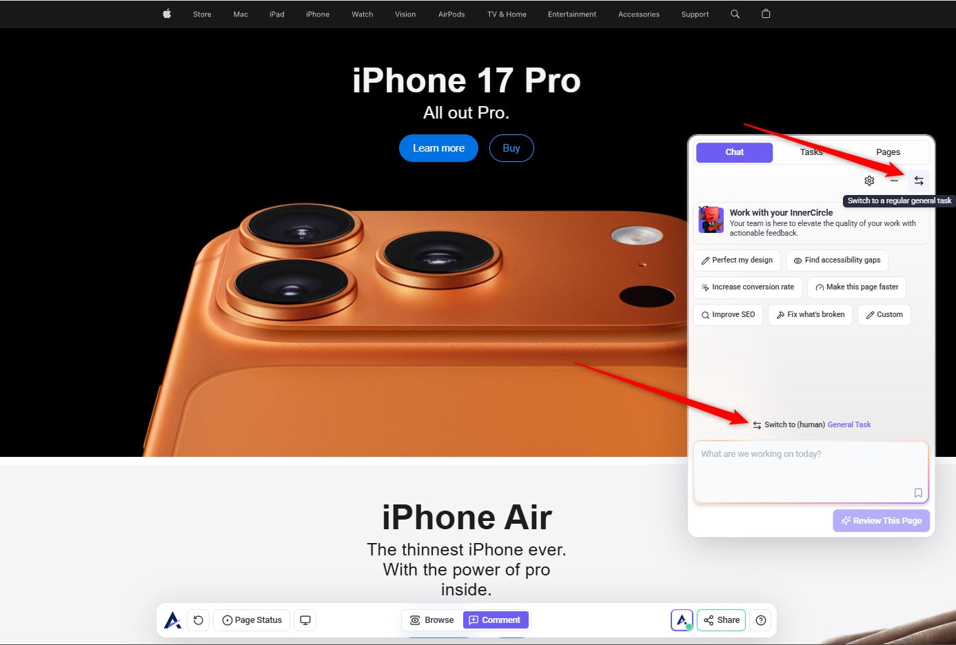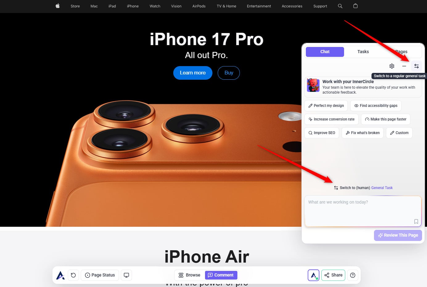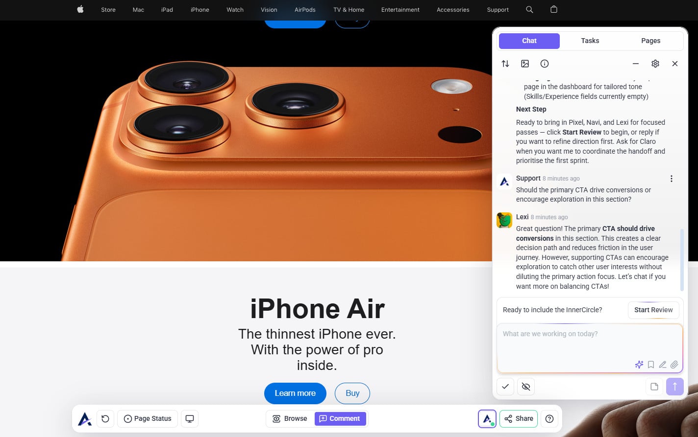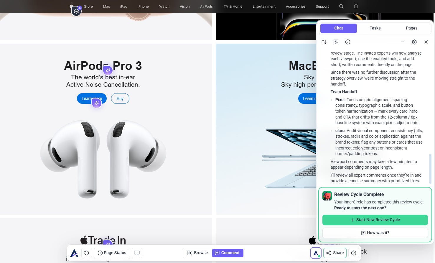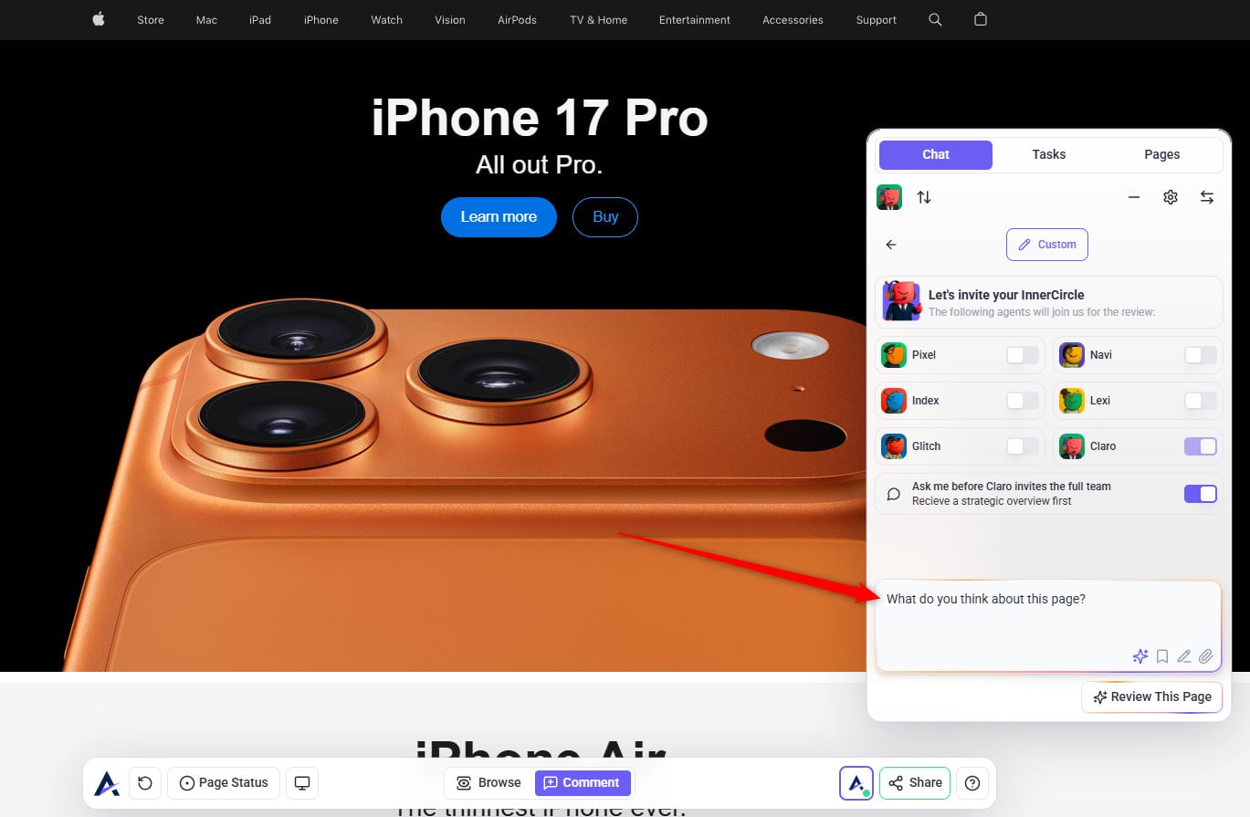 You don’t need to move to the expert review stage yet. You can still get valuable feedback from your Inner Circle using a general task — perfect for asking questions, sharing context, and gathering targeted insights before launching a full page review (Start Review). Once you invite the expert agents, they’ll analyze each viewport, use their available tools, and add short written comments directly on the page, so only start that stage when you’re ready for a deeper, structured review.