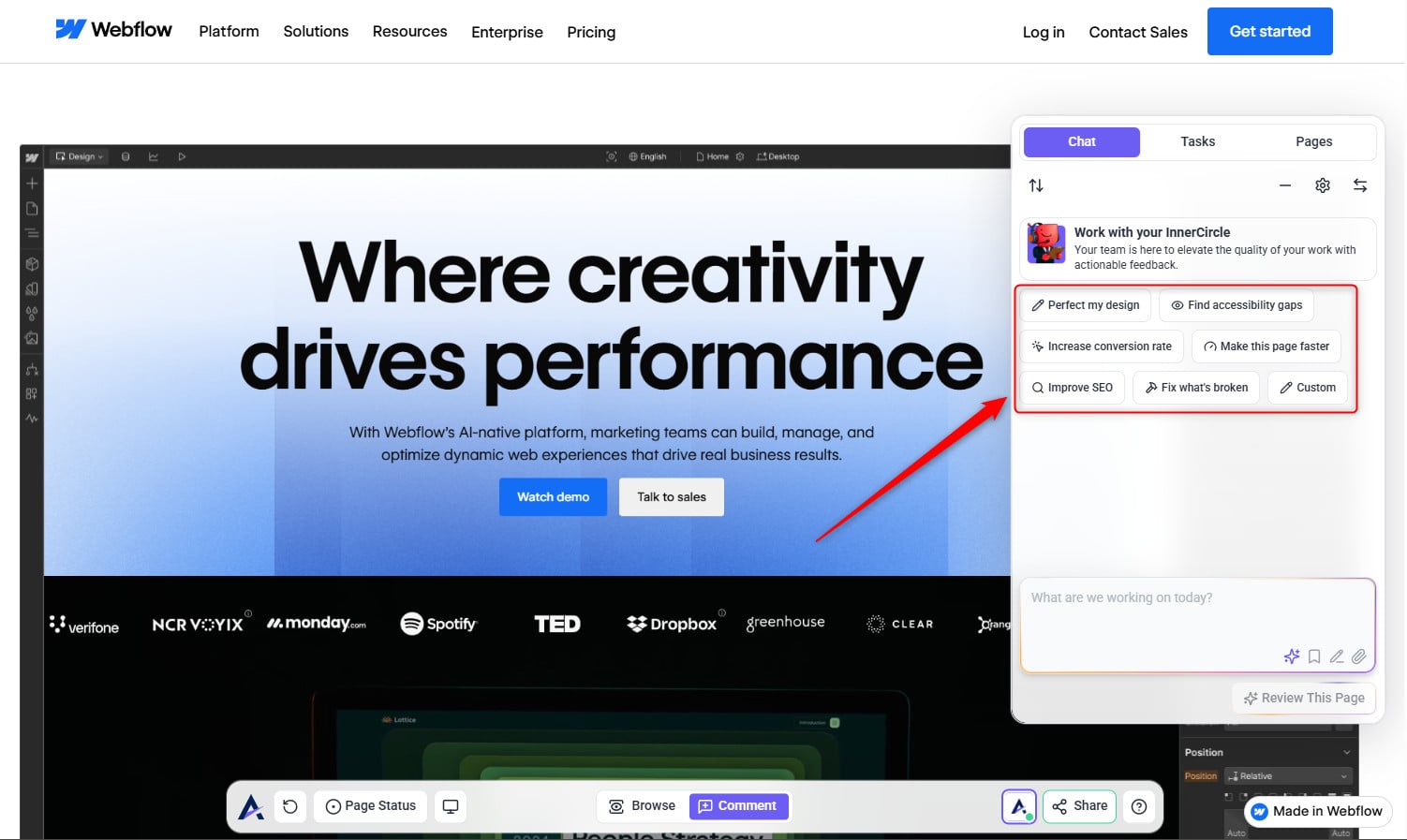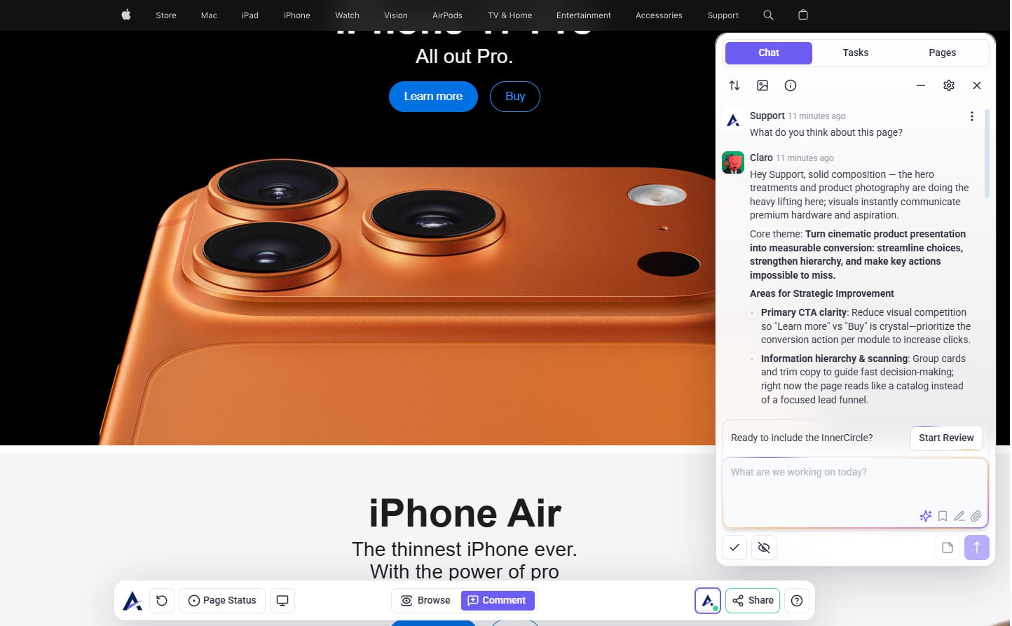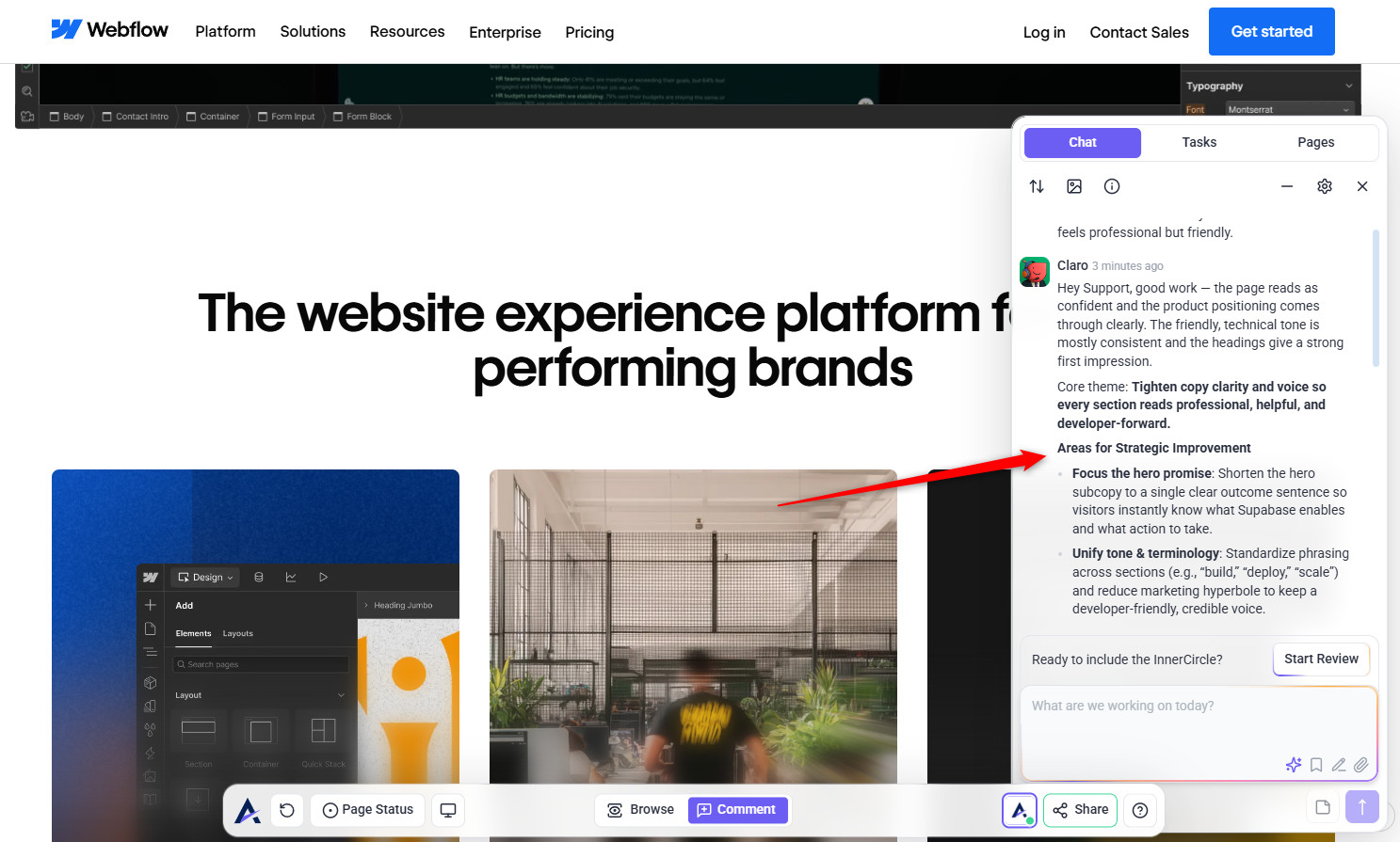 • Once you click Review This Page, the InnerCircle agents will automatically analyze your page. It scans a website to build a structured project brief, a summary that highlights strengths, weaknesses, and key opportunities for improvement across your design.