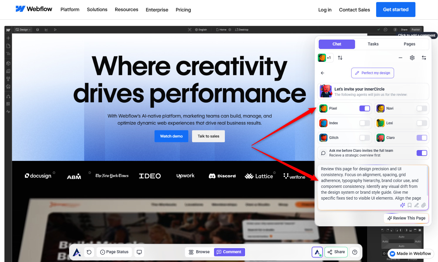 • Combine agents (e.g., Pixel + Lexi) for targeted design and copy insights.