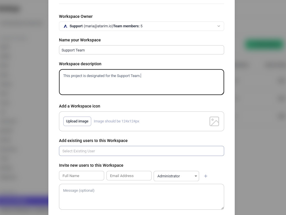 In the Workspace Settings tab, click “Create New Workspace”, enter details, and assign team members.