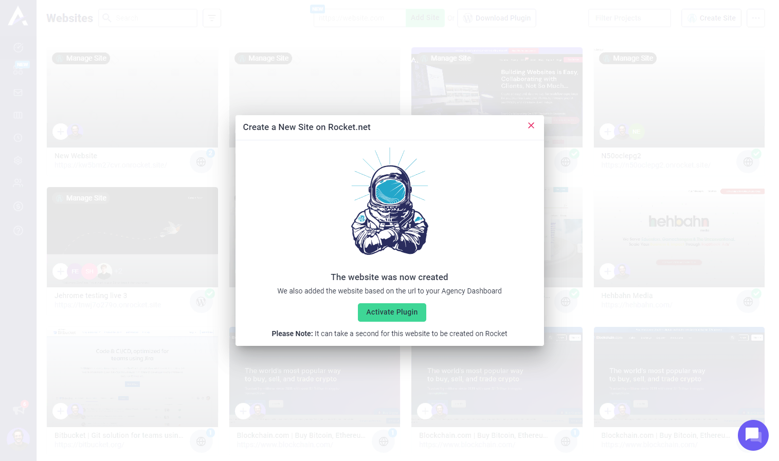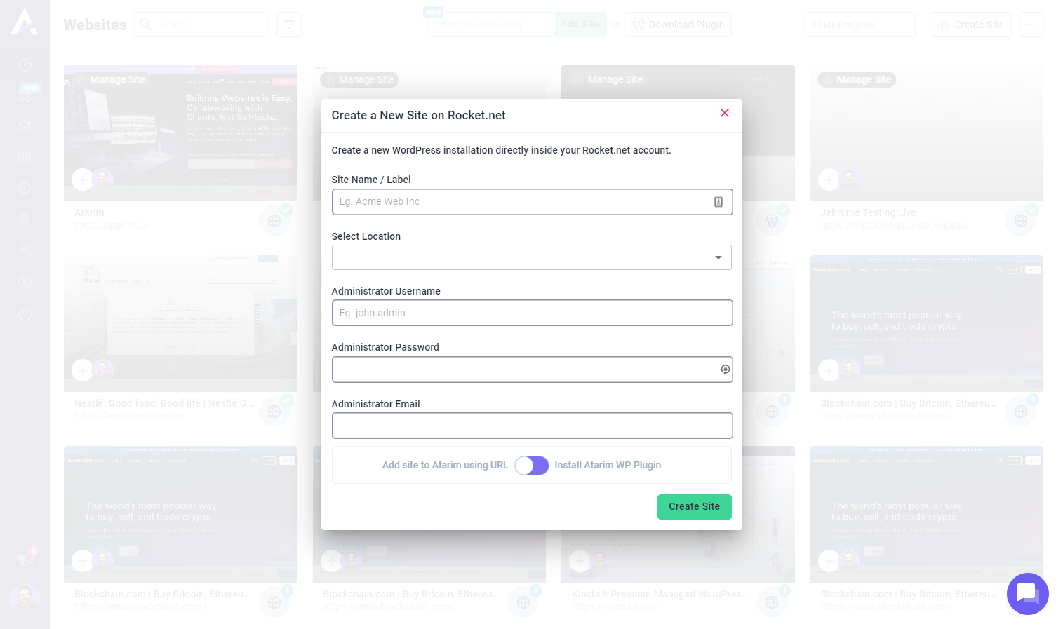 Clicking on “Create Site” will open a pop-up to create a staging enviroment on Rocket.net.