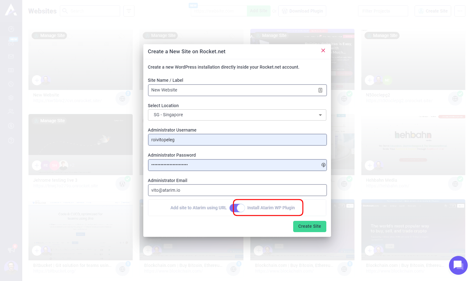 To automatically install the Atarim Plugin, you can toggle this on the site creation pop-up here.