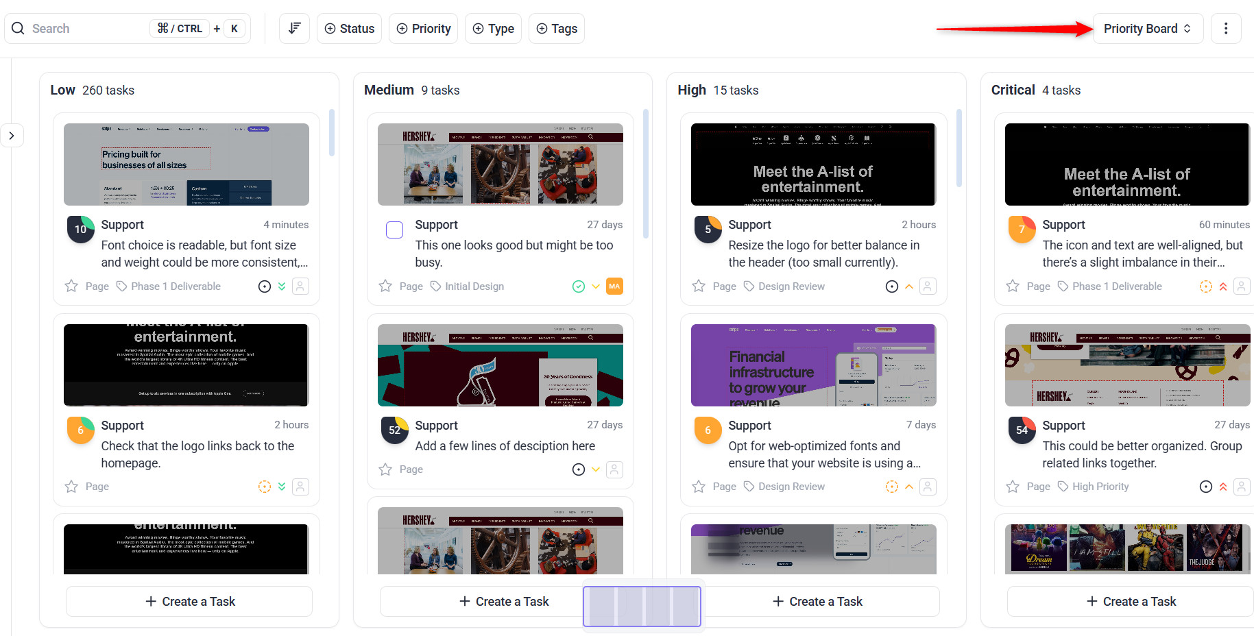 1. In your Project view, create distinct stages such as “Design review”, “responsiveness review”, “CTA review” and “Final testing”.