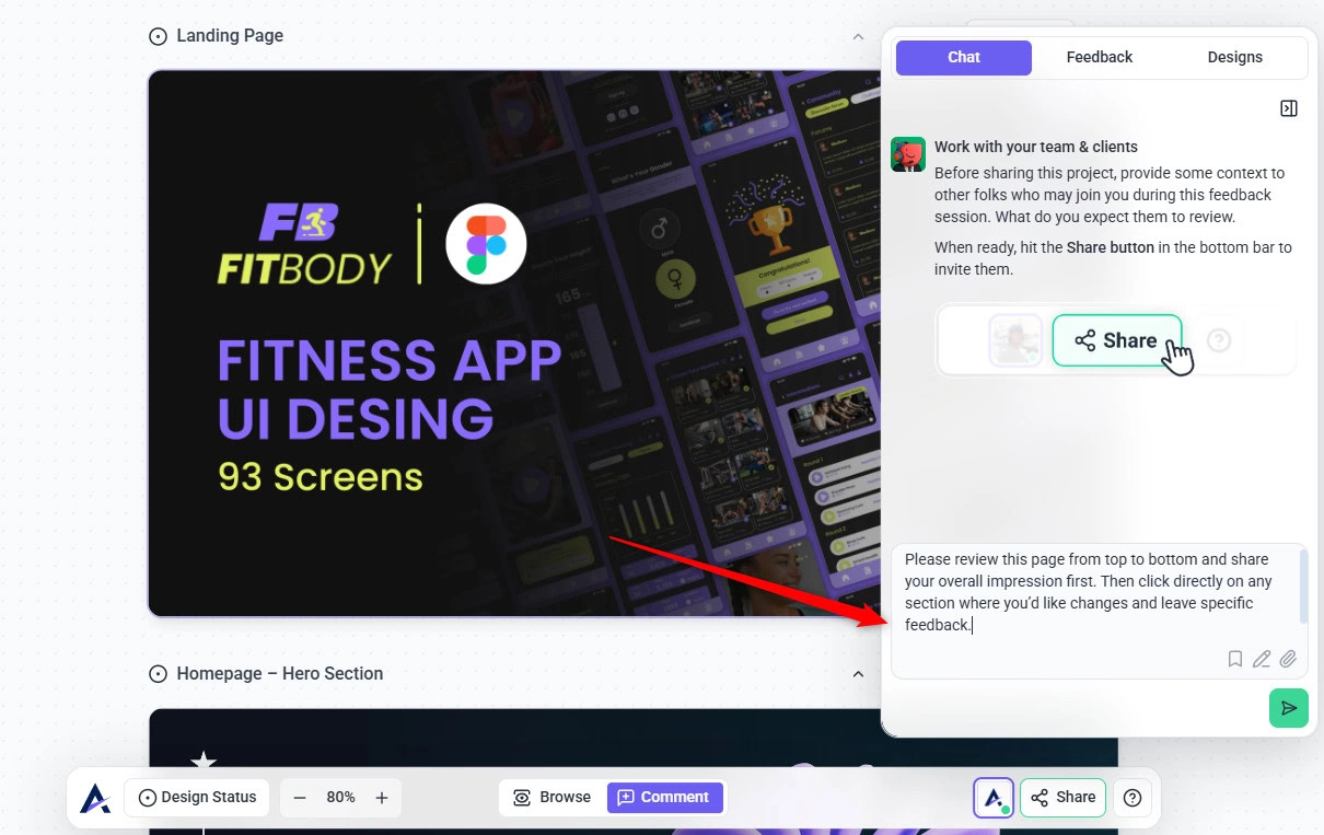 This creates a design project where team members, clients, and stakeholders can leave visual feedback directly on the design.